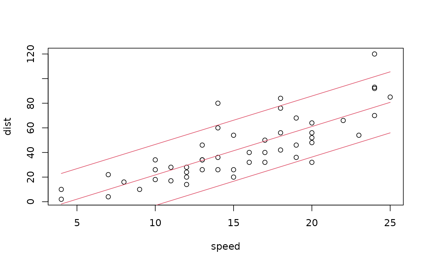 matplot(cars$speed, qd, add = TRUE, type = "l", col = 2, lty = 1)