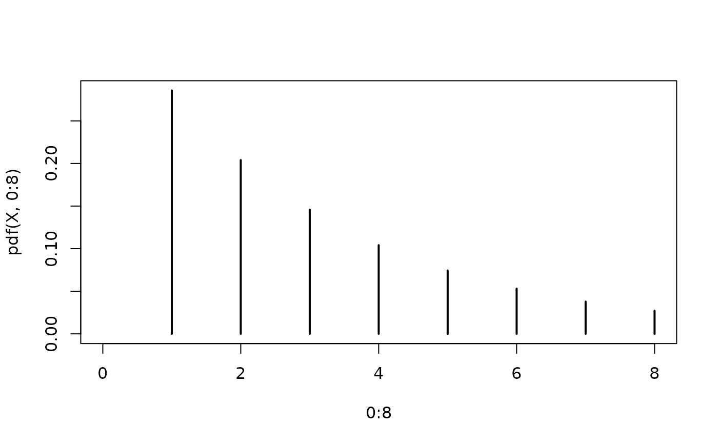 plot(0:8, pdf(X, 0:8), type = "h", lwd = 2)