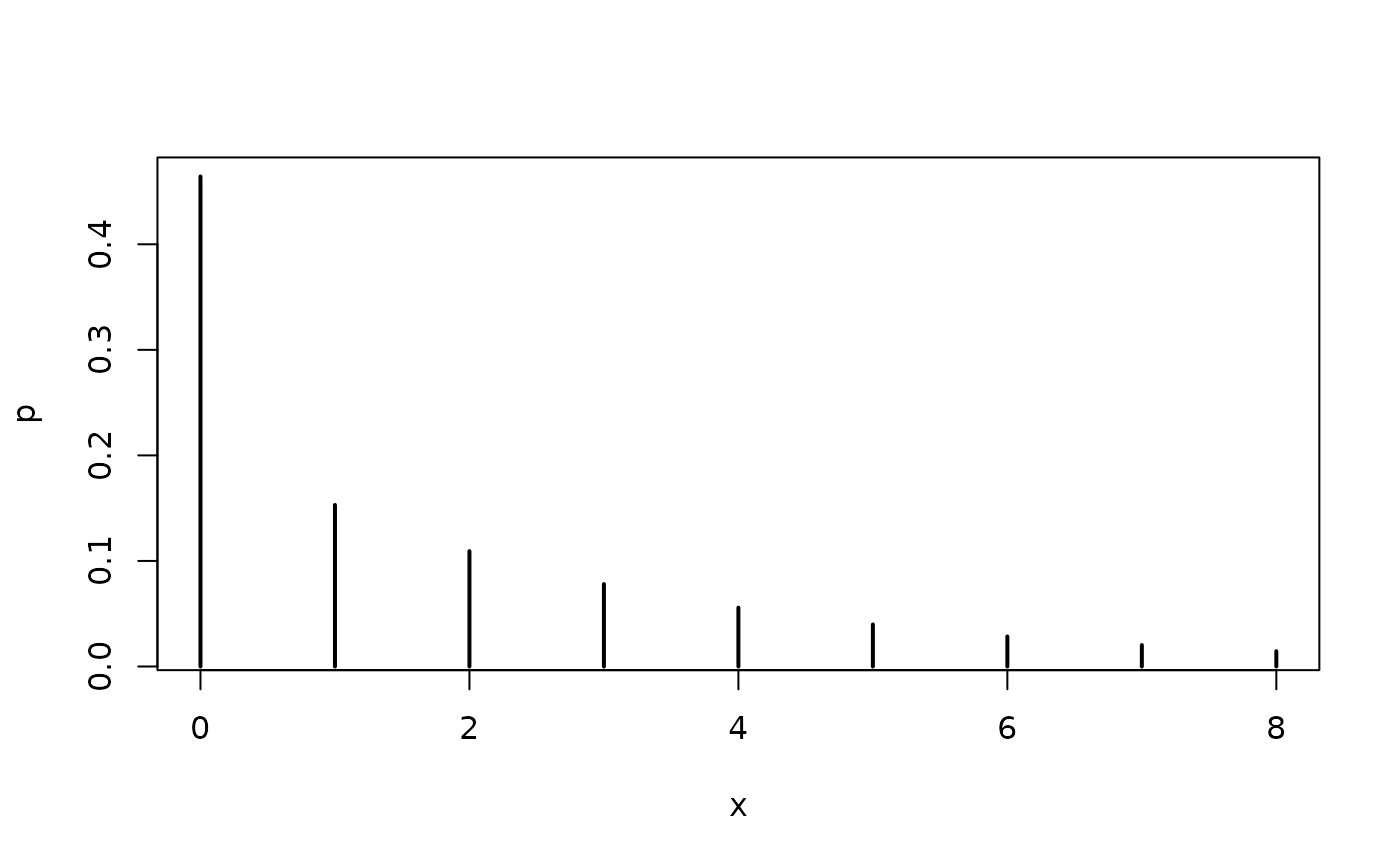 p <- dzinbinom(x, mu = 2.5, theta = 1, pi = 0.25)